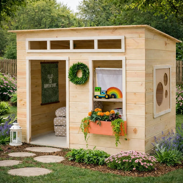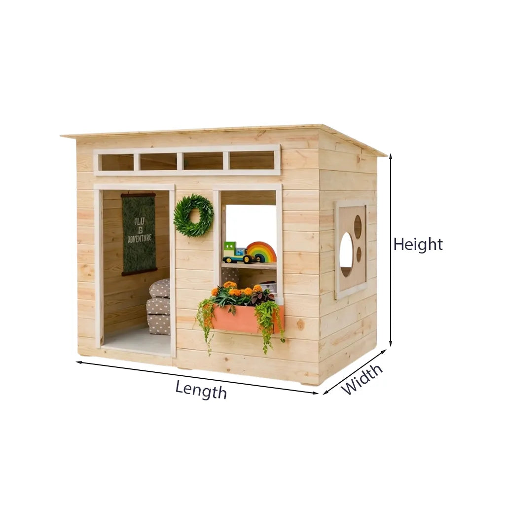 Create a playful and welcoming retreat with this modern wooden playhouse with flat roof and flower box window for outdoor. The clean boxy silhouette, light wood finish, and simple cottage inspired details bring a cheerful backyard feel while offering a cozy space for imaginative play and everyday outdoor fun.