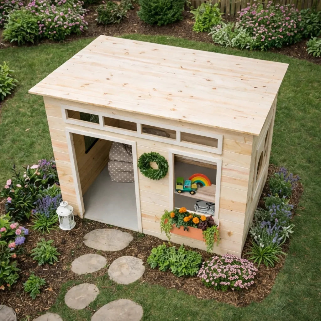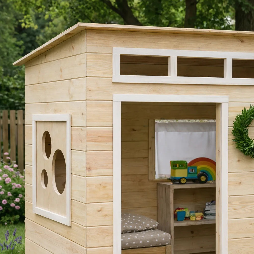 This playhouse features a wooden structure with a flat roof and clean straight lines that give it a simple modern look. The smooth plank exterior creates a neat and balanced appearance, while the open doorway helps the space feel easy to access and comfortable for daily play.