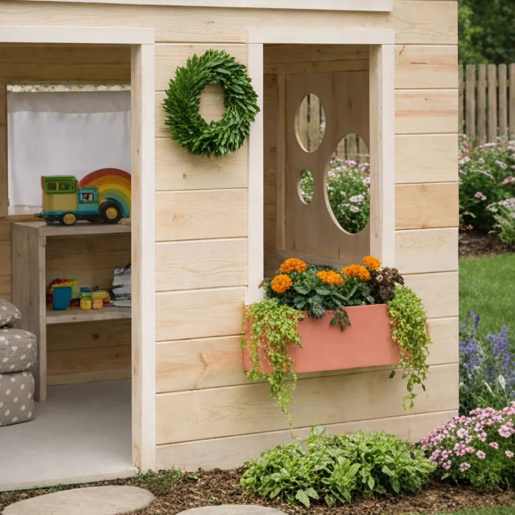 A front window with a flower box adds a decorative touch that softens the overall shape and gives the playhouse a more playful personality. The side window and upper horizontal opening bring in light and visual openness, helping the structure feel bright, airy, and inviting from multiple angles.