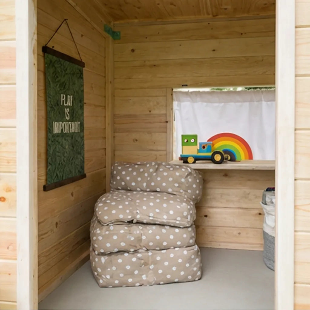 Color may appear slightly different in person due to lighting and individual monitor settings. Plants, toys, lanterns, and styling accessories shown are for display purposes only and are not included with the playhouse.