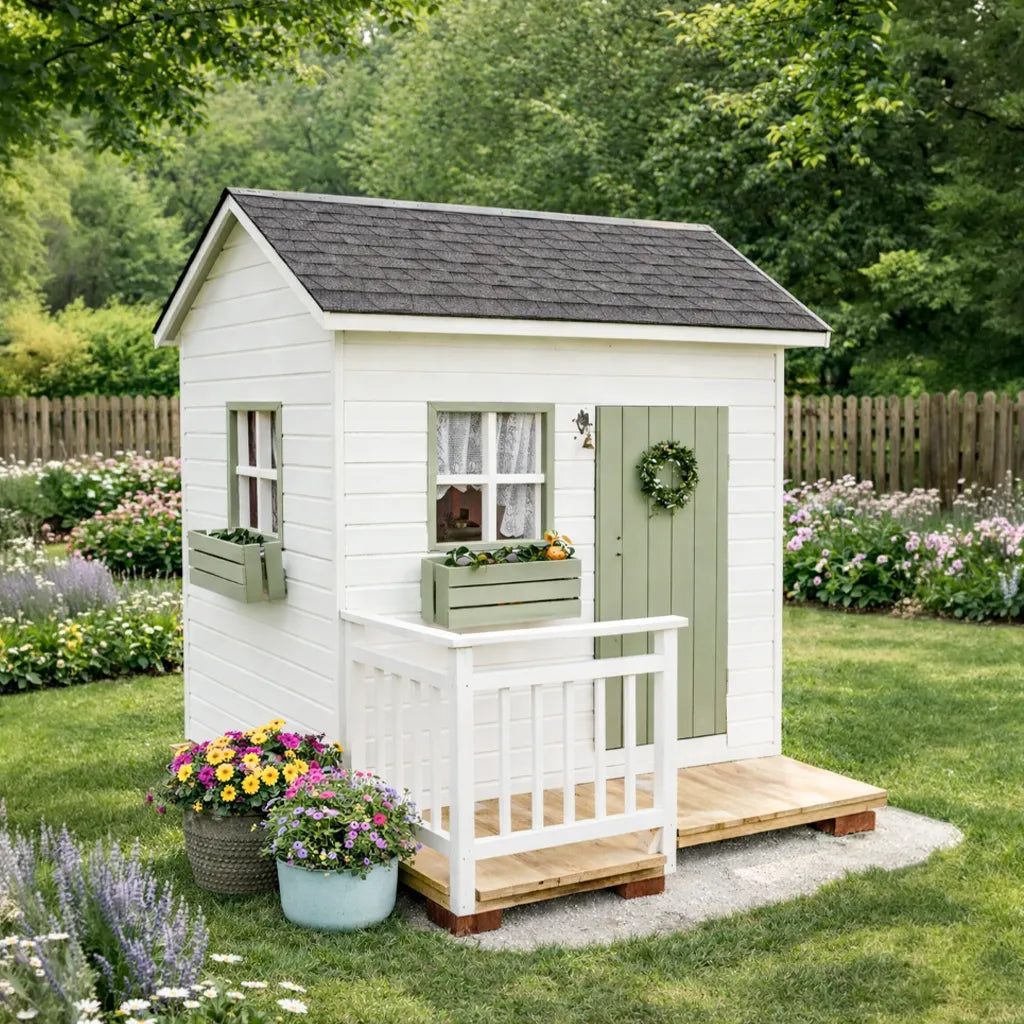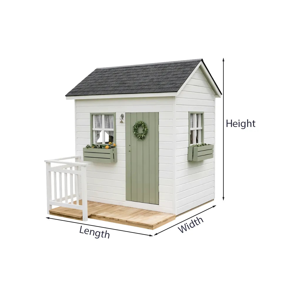 Create a charming and welcoming retreat with this modern wooden playhouse with gabled roof and window flower boxes for outdoor. The clean cottage inspired silhouette, soft painted finish, and simple front porch bring a calm backyard presence while offering a cozy space for imaginative play and relaxed outdoor moments.