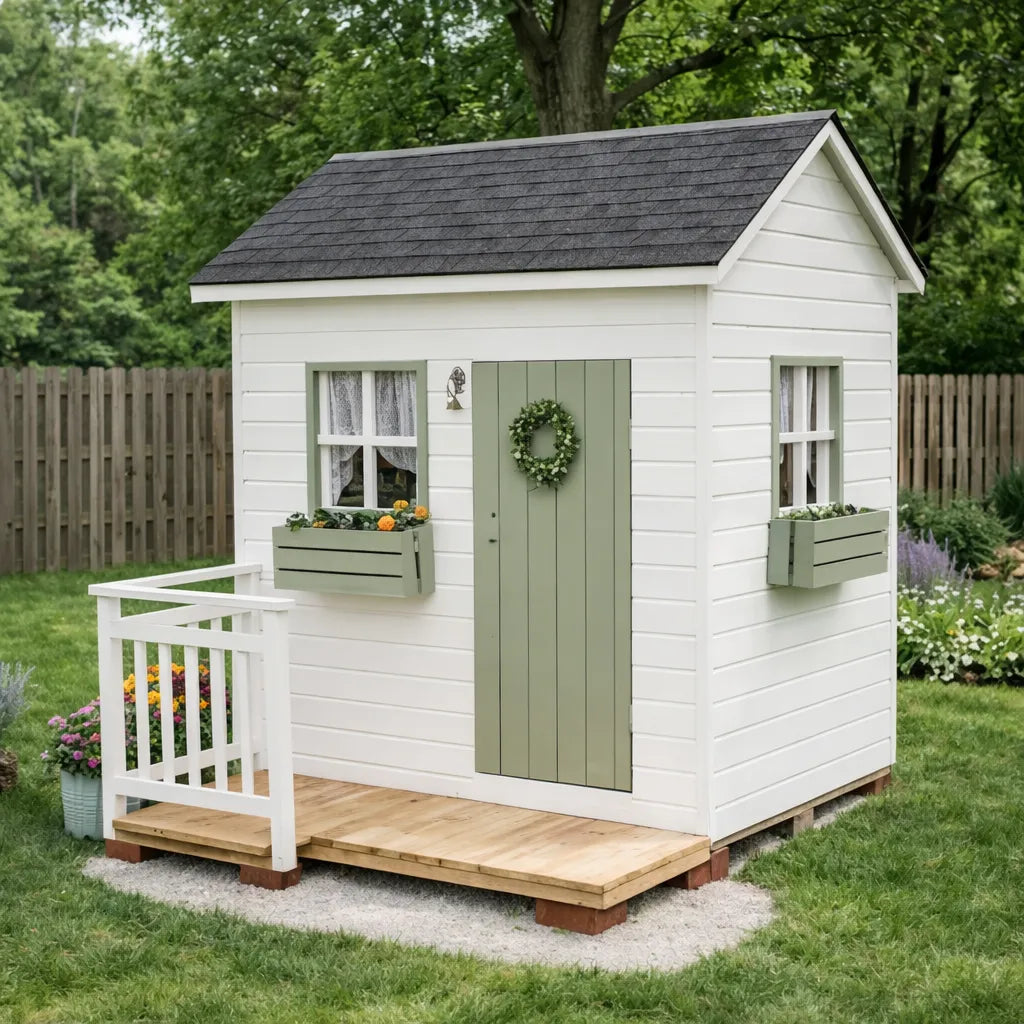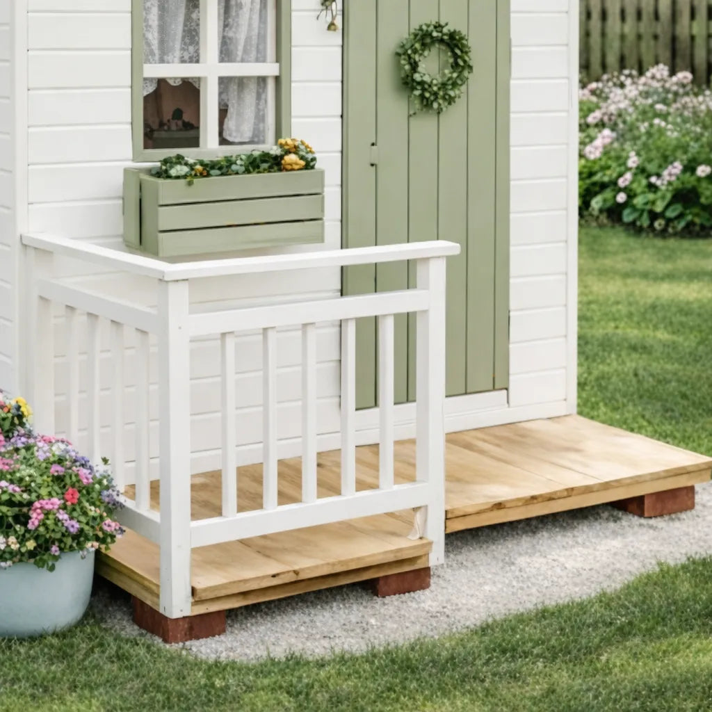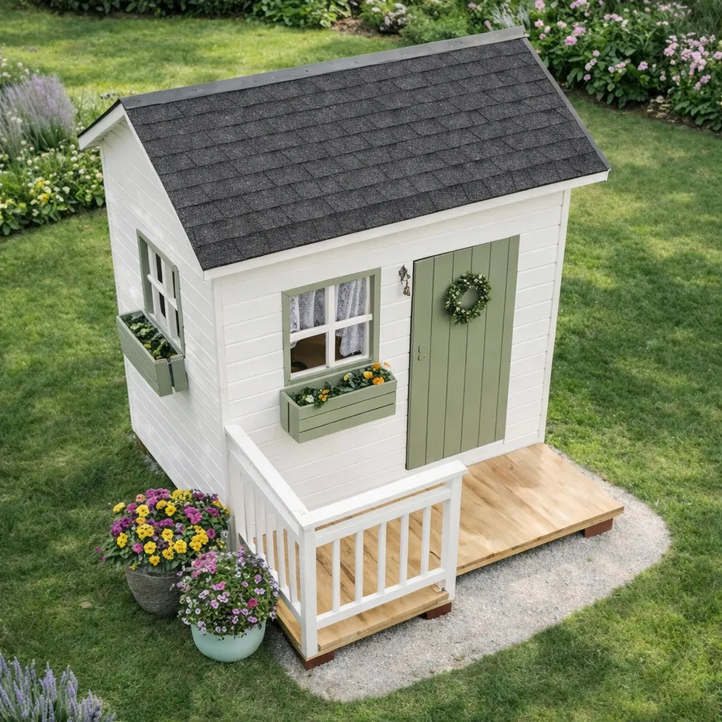 Window flower boxes add a decorative touch that softens the exterior and gives the playhouse a more playful personality. A small front porch with railing adds extra detail to the façade, creating a gentle sense of entry while making the structure feel more complete and home like from the outside.