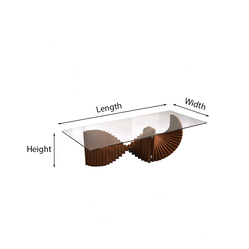 Below, two wooden supports run along the length of the table, formed from stepped, fan-like panels that create subtle shadow and depth. A central connector links both sides for stability while keeping the space underneath visually open. The warm wood-grain finish adds natural texture and balances the sleek glass with a cozy, inviting feel—ideal for modern and contemporary interiors.