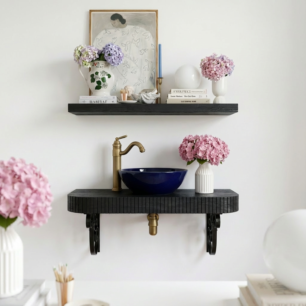 This Modern Wooden Wall Mounted Bathroom Vanity Shelf With Metal Brackets For Bathroom features a thick wooden shelf with a textured edge detail, supported by decorative metal brackets for a balanced, secure look. The open, floating layout keeps the wall feeling light while providing a practical surface for daily essentials. Its simple form pairs easily with minimalist décor, warm lighting, and mixed-material bathrooms.