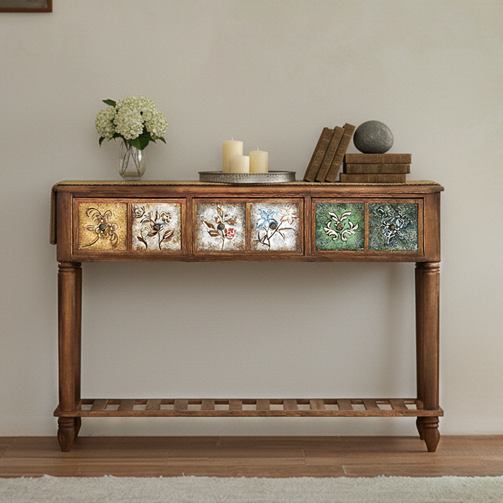 Introduce charm, character, and a touch of artistic nostalgia to your home with this vintage-inspired artistic wooden console table with floral panels. Featuring a row of decorative painted floral fronts and a warm rustic finish, this console becomes an expressive focal point in any room.